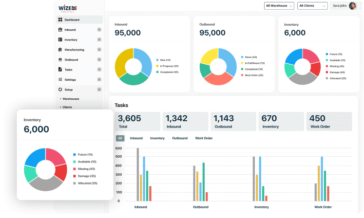 Get instant clarity and control with WizeFulfill’s Warehouse Management Dashboard. This unified warehouse dashboard brings together real-time insights on inventory, warehouse tasks, and fulfillment workflows—giving you a single source of truth so every decision is fast and data-driven.